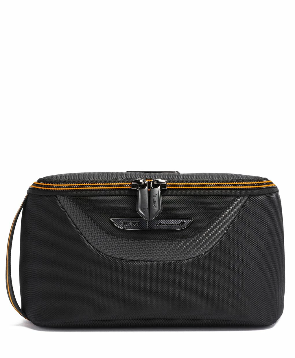 CX6 carbon fiber accents and McLaren’s signature Papaya spotlight this soft-sided kit’s automotive inspiration. It opens flat for easy access while a clear window gives sight to everything you pack.