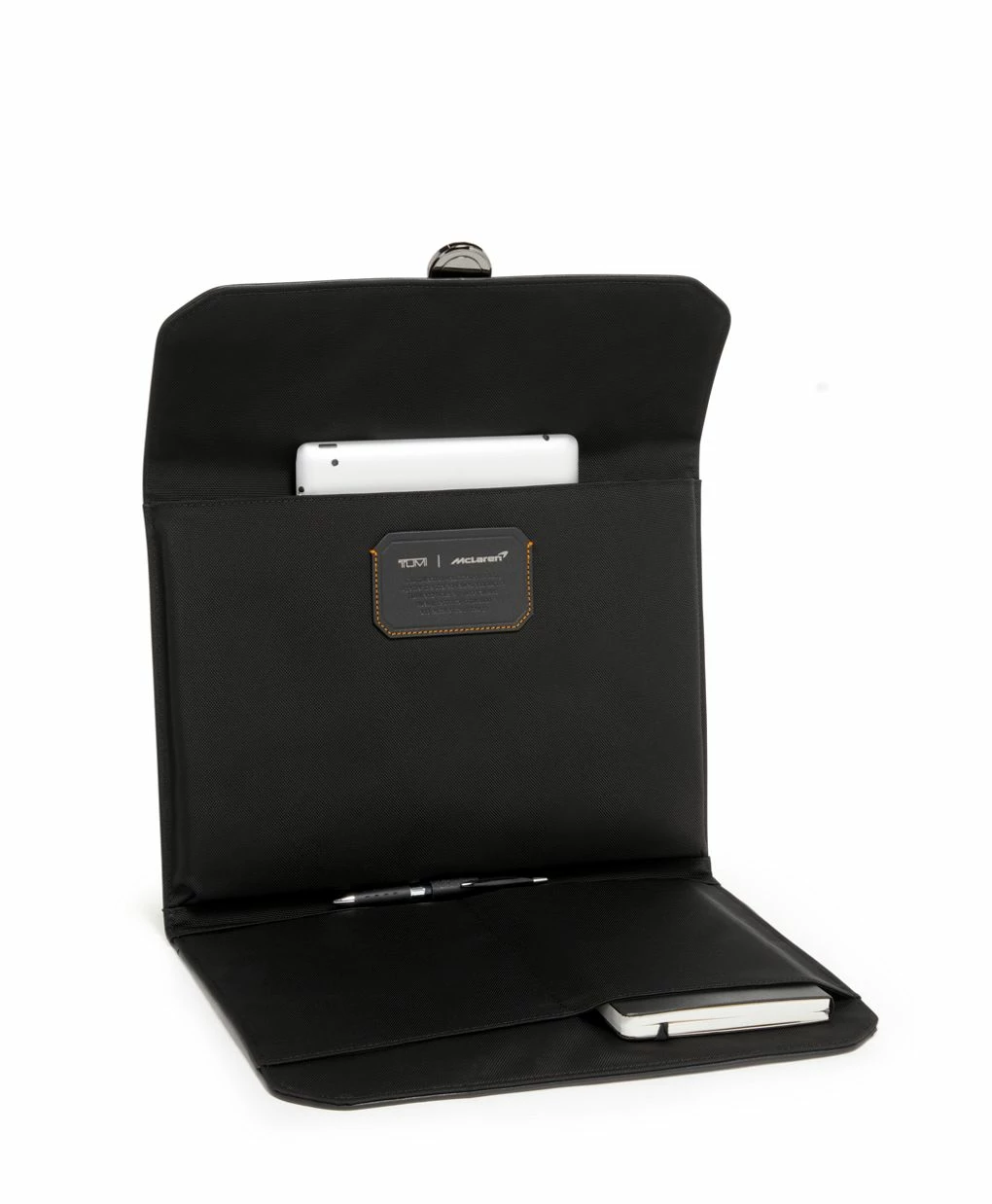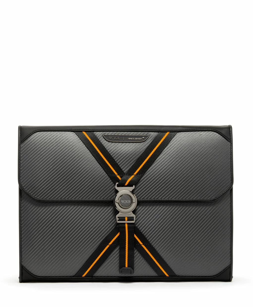 Organize important papers and essentials with this sleek and modern portfolio featuring the aerodynamic lines, CX6 carbon fiber detailing and signature Papaya accents of McLaren supercars.